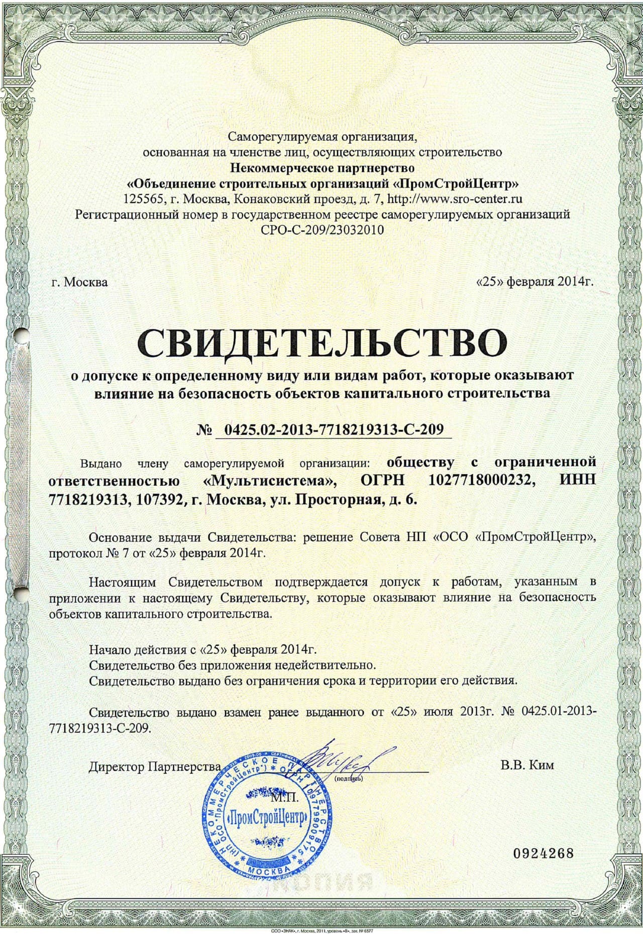 Свидетельство саморегулируемой организации в строительстве: СРО-С-209/23032010 от 25 февраля 2014г.